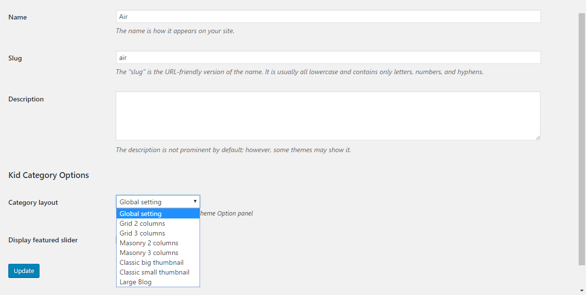 To add new Category,input Name,slug(Optional),choose Parent(Optional). Then press Add New Category