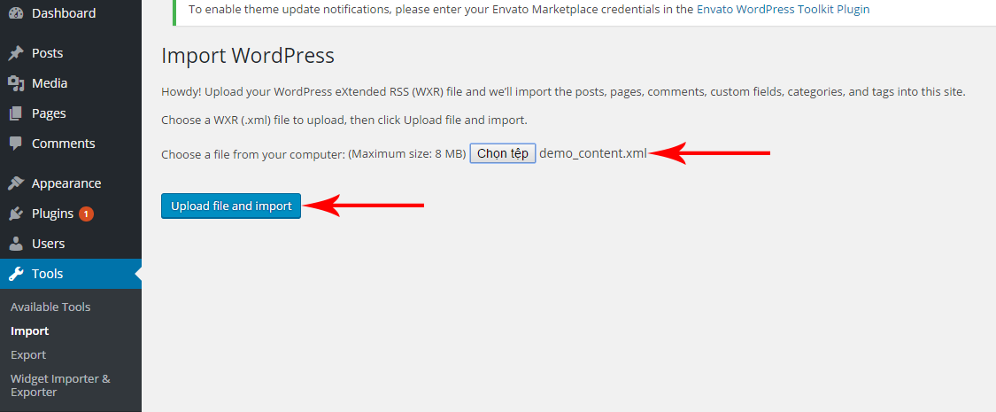 ➢ Choose a demo_content.xml file from your download package and then click on Upload file and Import